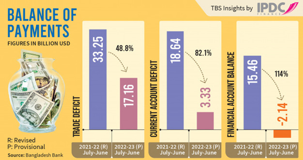 Bangladesh's trade deficit shrank by 48% in FY23, as imports declined and exports grew modestly. The current account deficit also narrowed significantly, to $3.33 billion from $18.64 billion in FY22. (Finance Report, The Financial Express)