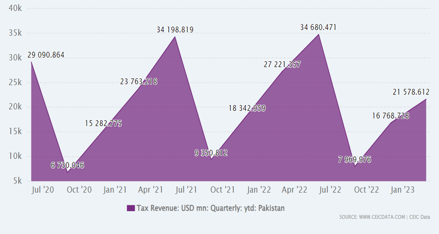 In March 2023, Pakistan's tax revenue was reported to be 21.579 USD billion. This represents an increase over the previous figure of 16.769 USD billion for December 2022. (CEIC Data)