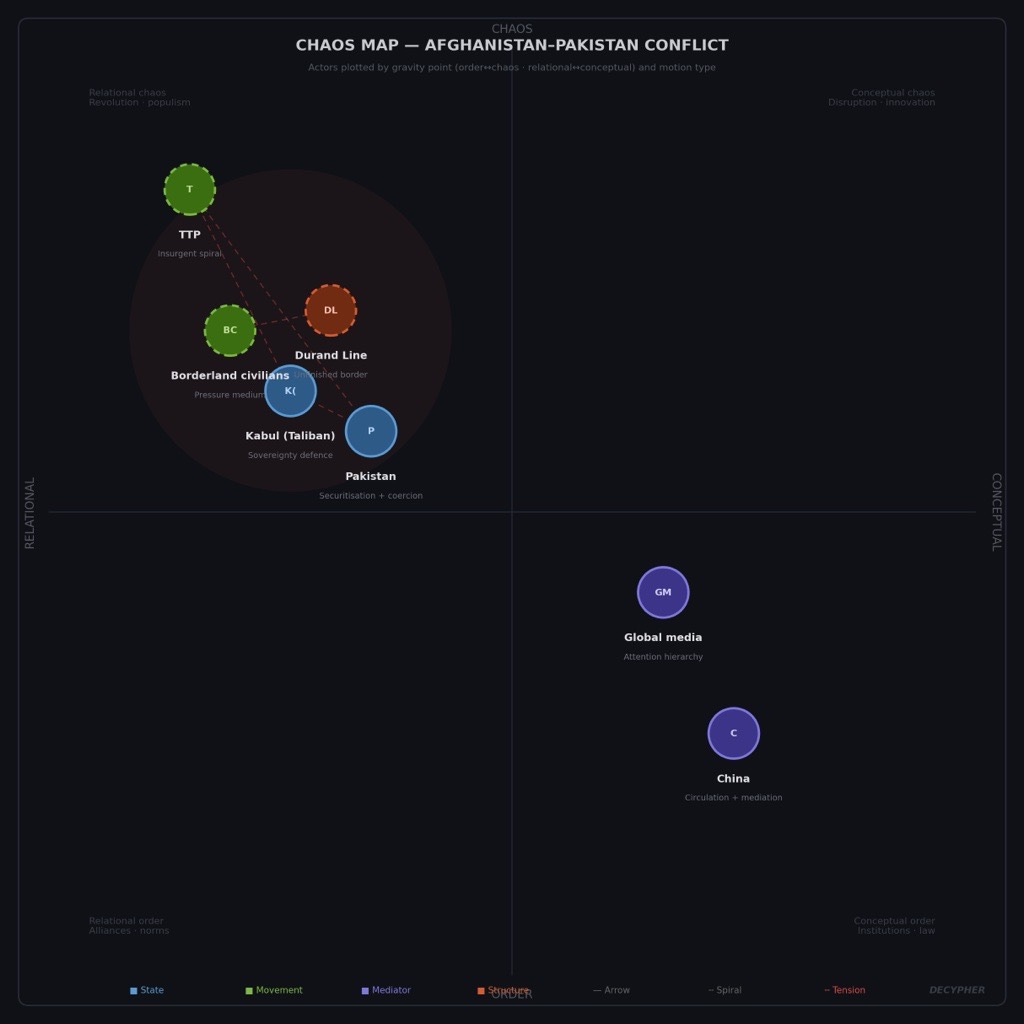 The conflict cluster sits deep in relational chaos: Pakistan, Kabul, the TTP, borderland civilians, and even the Durand Line occupy the same unstable zone. There is no shared legal framework, accepted border regime, or institutional arbiter. The dispute is therefore fought through relational leverage — coercion, sovereignty claims, tribal loyalties, and narrative control.