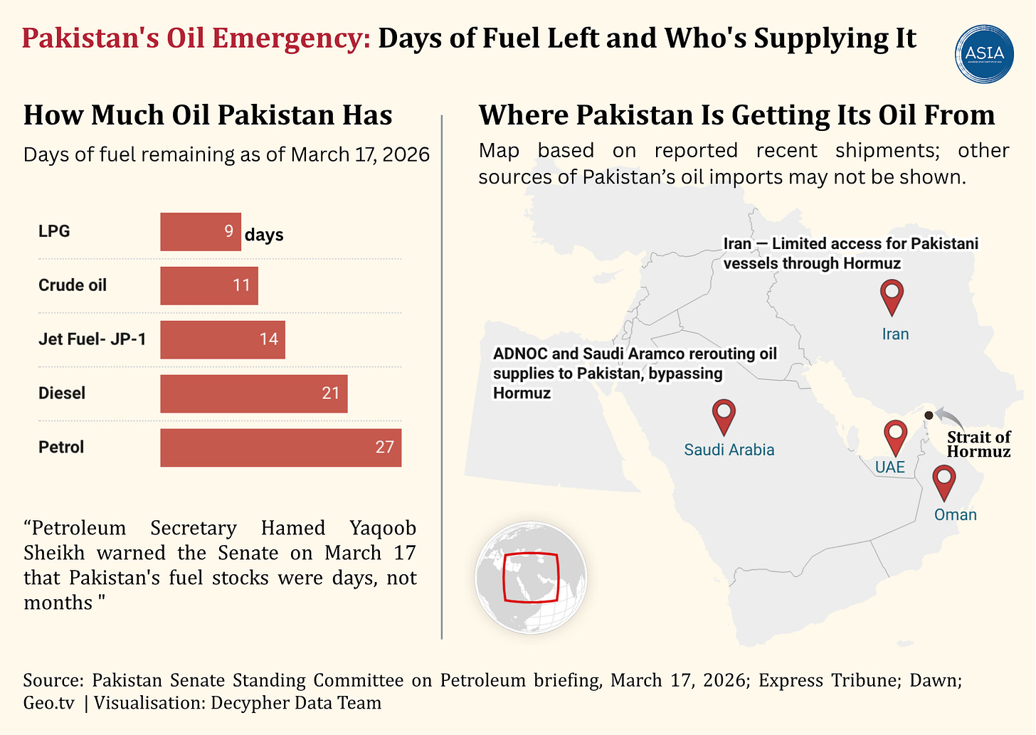 As of March 17, 2026, Pakistan had 27 days of petrol reserves and 21 days of diesel stocks remaining, according to the Senate Standing Committee on Petroleum briefing. Emergency fuel supplies are coming primarily from Saudi Arabia and the UAE, with some shipments being rerouted to bypass the Strait of Hormuz and limited passage allowed for select Pakistani vessels.