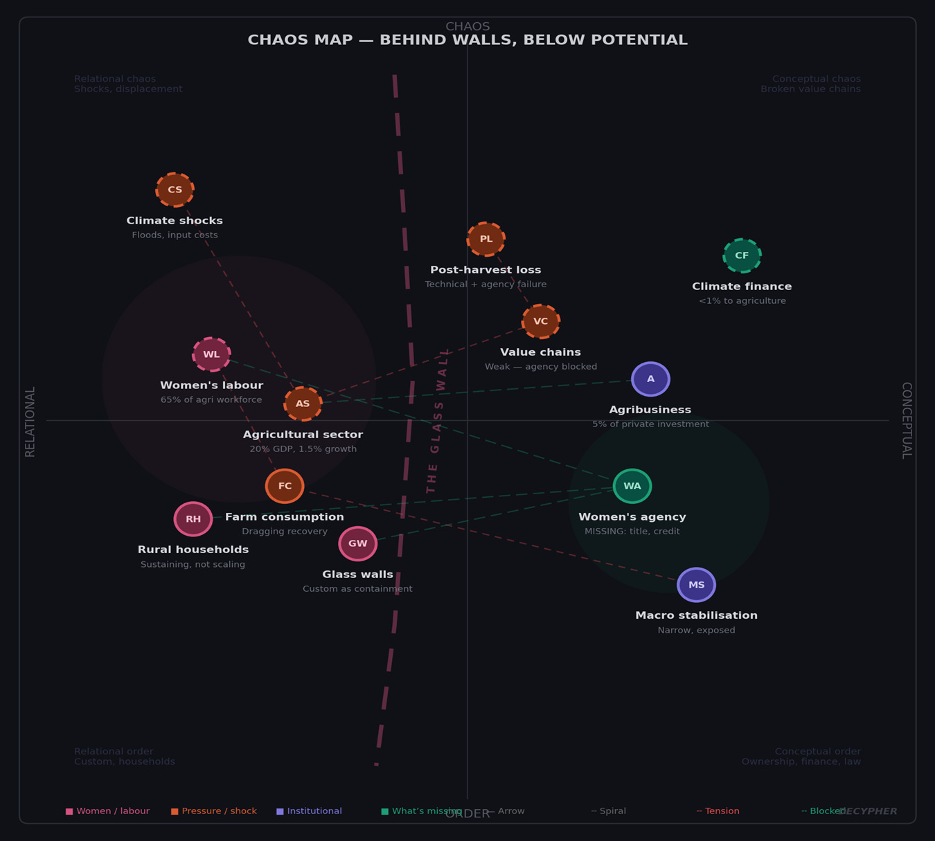 The right side is hollow. Women’s agency sits in conceptual order as the thing that should exist but doesn’t. Agribusiness is there but starved (5% of private investment). Climate finance is there but negligible (less than 1% to agriculture). Macro stabilisation is there but can’t reach the agricultural cluster because the sector’s relational base — households, women, consumption — is trapped on the other side of the wall.