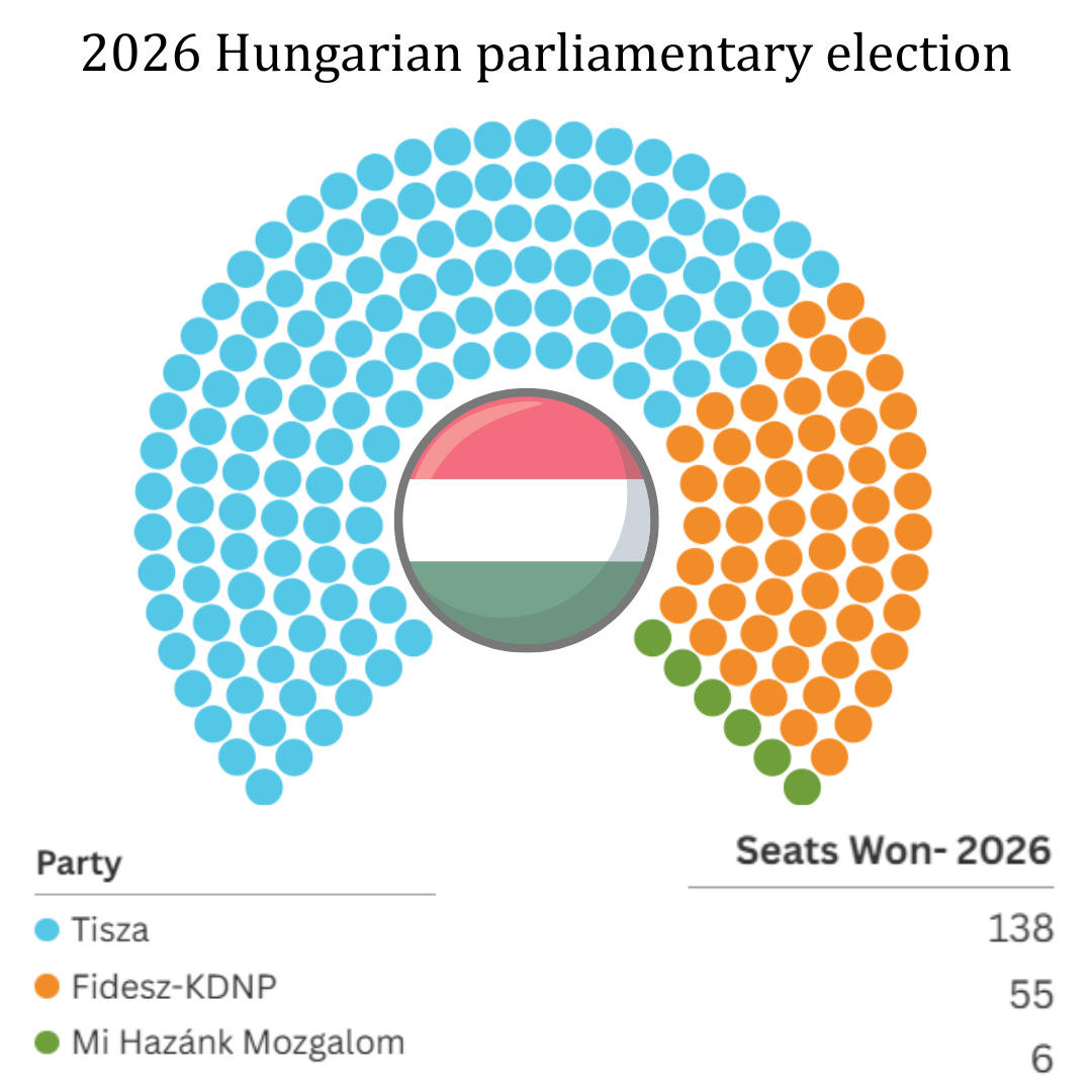 Péter Magyar’s Tisza party took 138 of 199 parliamentary seats — a constitutional supermajority — on 53.6 per cent of the popular vote, at a record turnout of nearly 80 per cent. Orbán conceded on election night. Fidesz, which held a two-thirds majority for three consecutive terms, was reduced to 55 seats. The margin was not close enough to contest, not narrow enough to spin. The system Orbán built over sixteen years — the captured judiciary, the oligarchic economy, the rigged electoral map — could not absorb the popular deficit of trust. The machine broke under the weight of its own corruption.