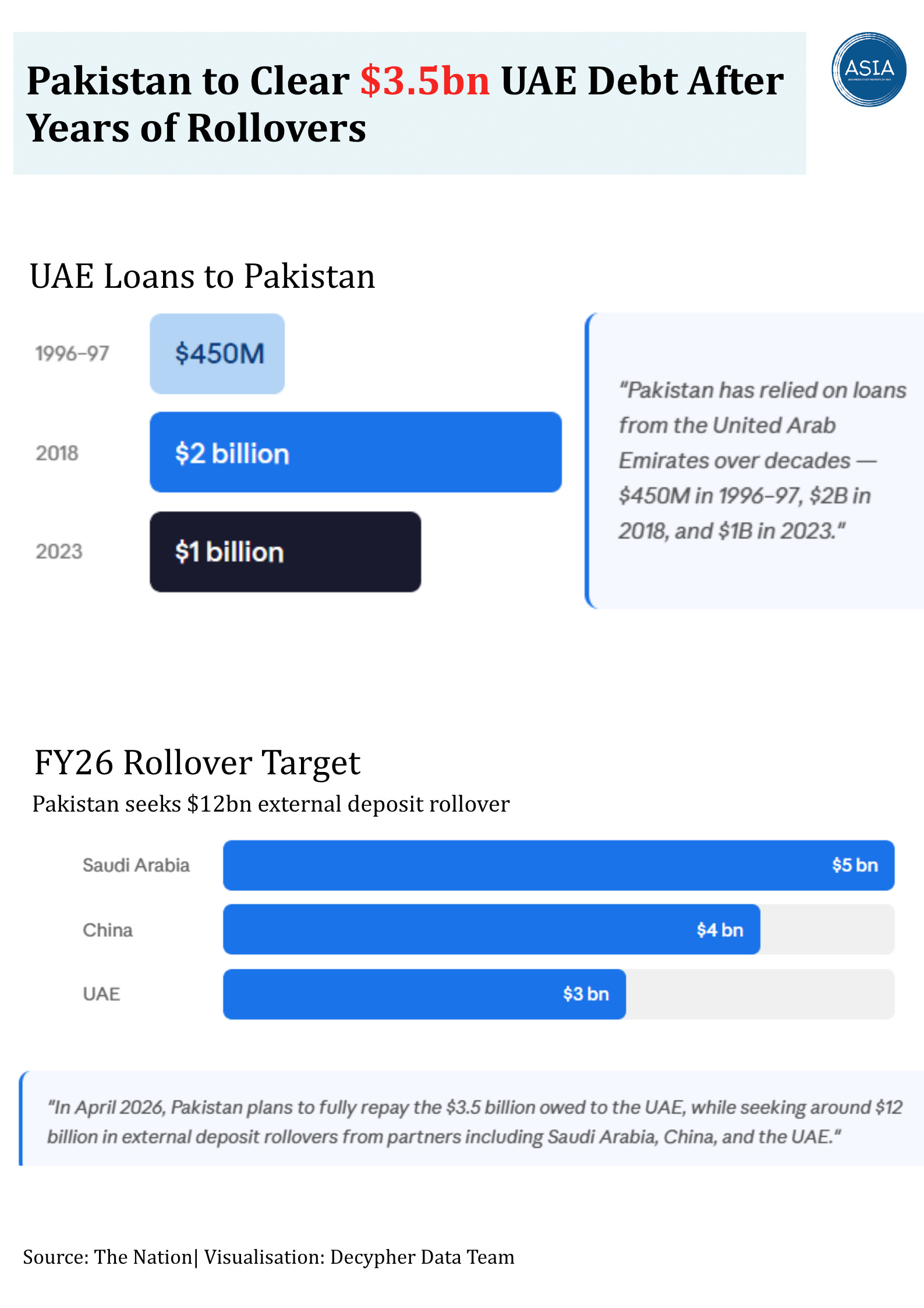 Pakistan is set to repay $3.5 billion to the UAE by month-end, including a $2 billion deposit extended in 2018, a $1 billion loan provided in 2023, and an older $450 million loan dating back to 1996–97. The 2018 facility had been rolled over annually after Pakistan was unable to repay it on schedule.