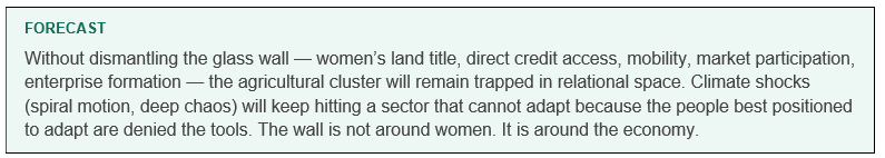 The left side is full. Women’s labour, rural households, farm consumption, the agricultural sector itself — all cluster in relational space. This is a sector sustained by relational energy (people working, households managing, crops planted and harvested) but structurally prevented from converting that energy into conceptual infrastructure (titles, credit, value chain position, enterprise). The labour is visible. The agency is unreachable. That is what a glass wall does on a map: it lets you see across but not move across.