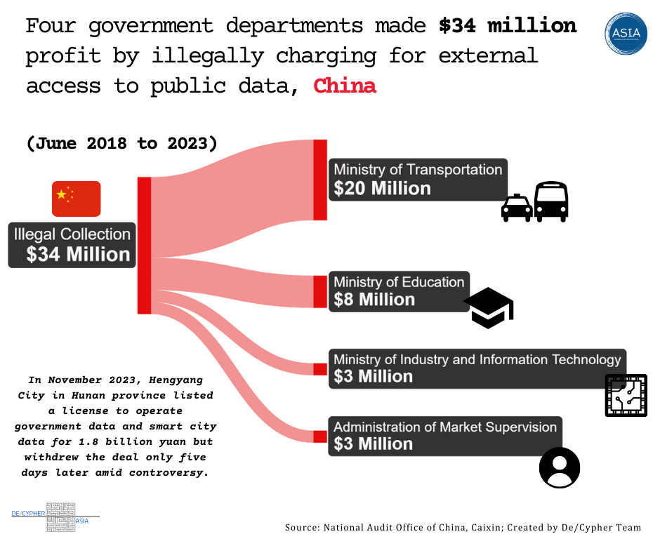 According to the National Audit Office of China, seven organizations from four government departments profited illegally by charging $34 million for unauthorized external access to public data. (Caixin)