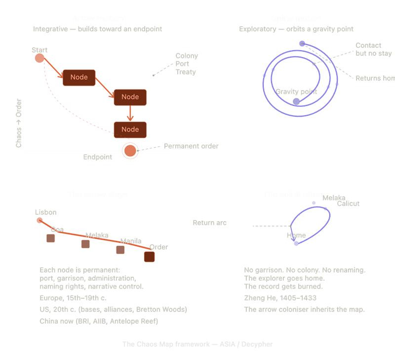The lesson China drew from the Ming withdrawal is the lesson the Chaos Map makes legible: spiral motion creates beautiful histories but no lasting authority. The explorer who returns home gets written out of the record by the coloniser who stays. If China wants to avoid a second overwriting, it must not merely explore or trade or mediate. It must build the institutional architecture — the conceptual order — that makes its presence the operational reality rather than a historical footnote. That is what it is doing. Whether it is doing it well, or justly, or sustainably, is a separate question. That it is doing it structurally is not.