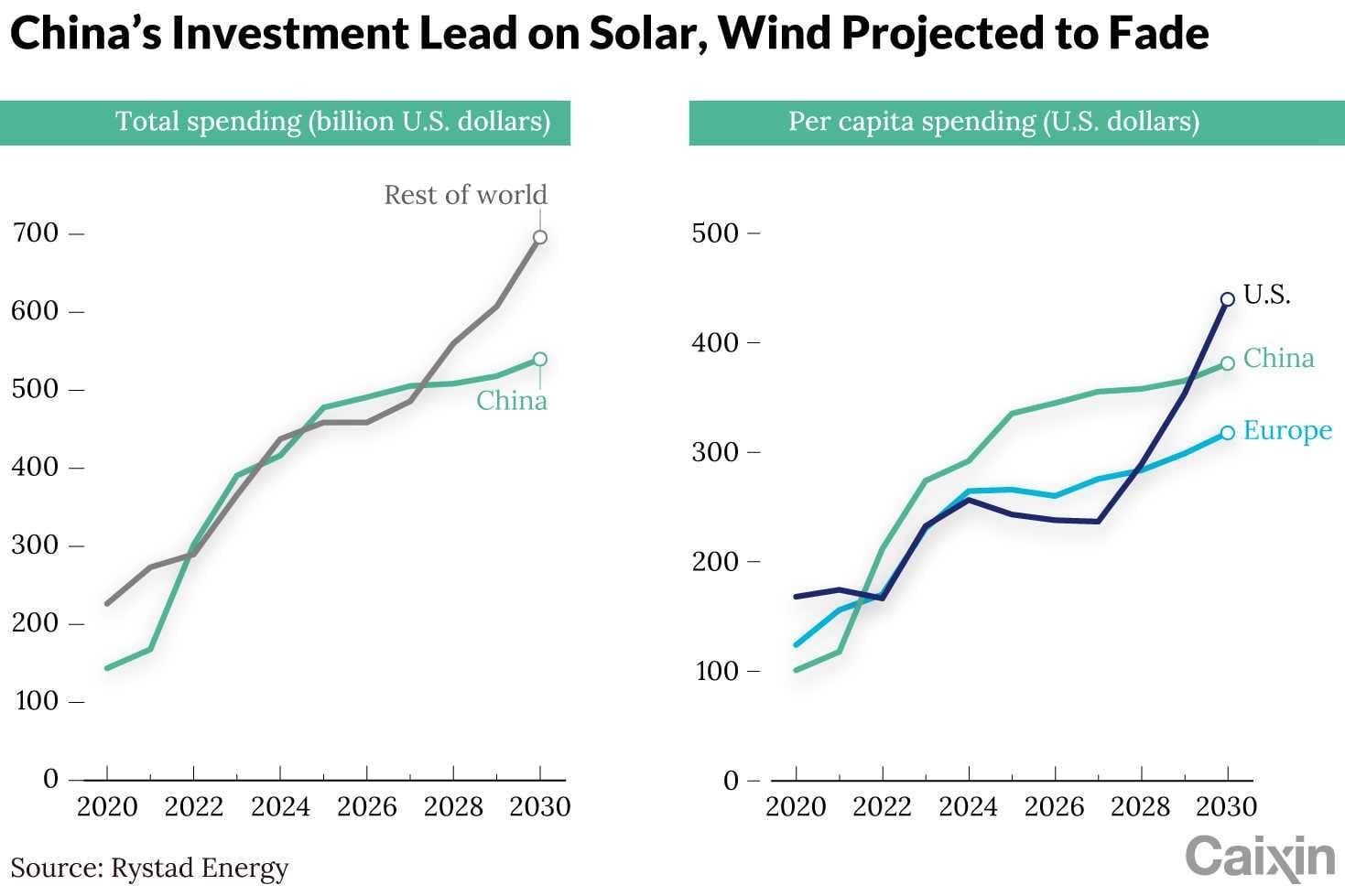 Caixin reports that China’s annual investments in wind and solar power have outpaced the rest of the world’s due to a strong government push, but its lead is narrowing as other countries boost spending on the industry, according to a report by Rystad Energy, a Norway-based think tank.