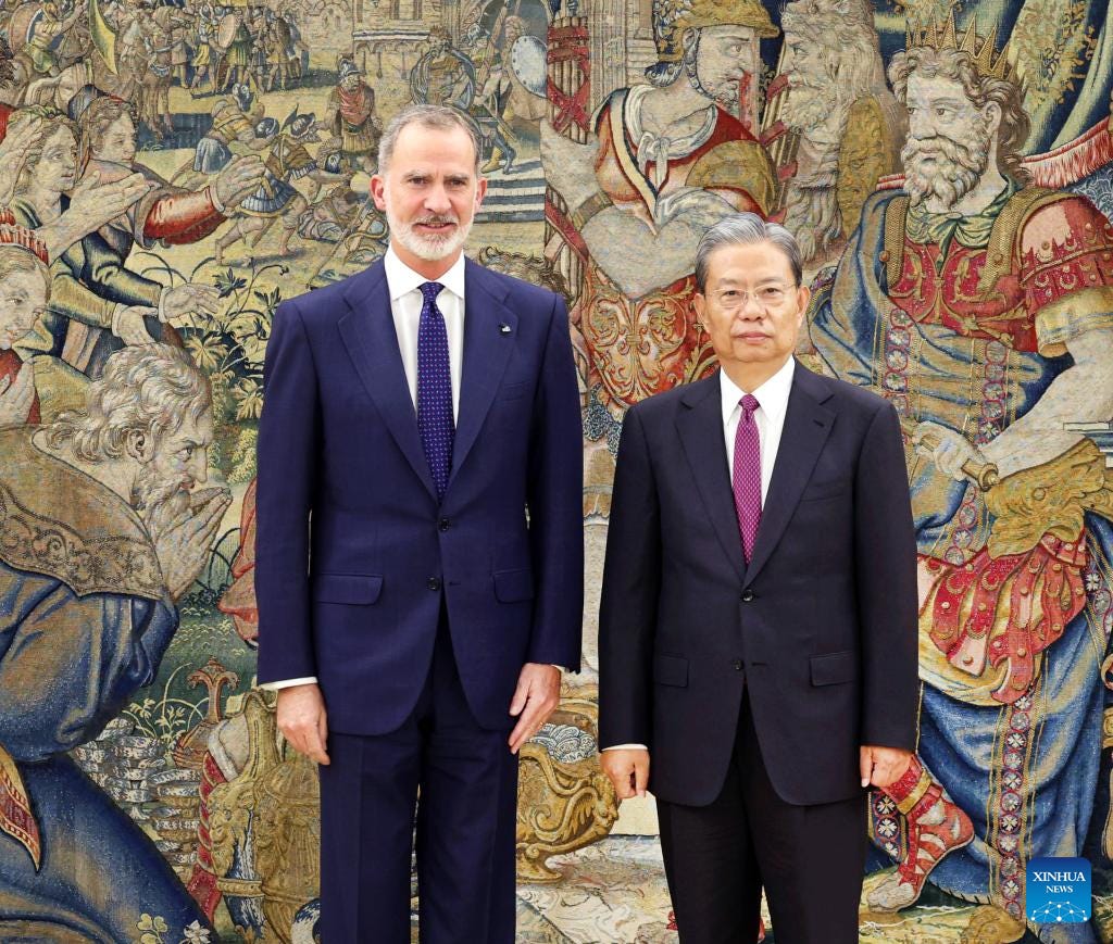 Xinhua reports that Zhao Leji, chairman of the National People's Congress Standing Committee, emphasised China's commitment to strengthening ties with Spain during an official visit from 23 to 27 November. Zhao met with Spanish leaders, including King Felipe VI and Prime Minister Pedro Sanchez, to discuss collaboration in trade, energy, and cultural exchange. The visit marked preparations for the 20th anniversary of the China-Spain comprehensive strategic partnership, with a focus on mutual development and tackling global challenges like climate change.