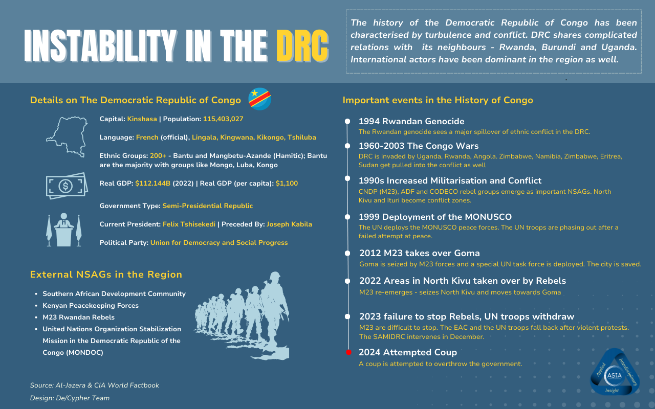 The Democratic Republic of the Congo (DRC) has historically been embroiled in a complex web of challenges, with political unrest, armed conflicts, and dire humanitarian conditions. The colonial legacy of the Great Lakes region in Africa has led to the emergence of several ethnic and political challenges. These challenges have contemporary manifestations and the complicated regional dynamics, including Rwanda, Burundi, Uganda and the DRC, are proof. The state lines drawn after the end of colonialism have led to the scattering of ethnic populations across these states. Coupled with rich natural resources, the DRC has emerged as a challenging country where ethnic differences has led to fighting for access to land, water and power. The recent instability in the DRC has been discussed below.